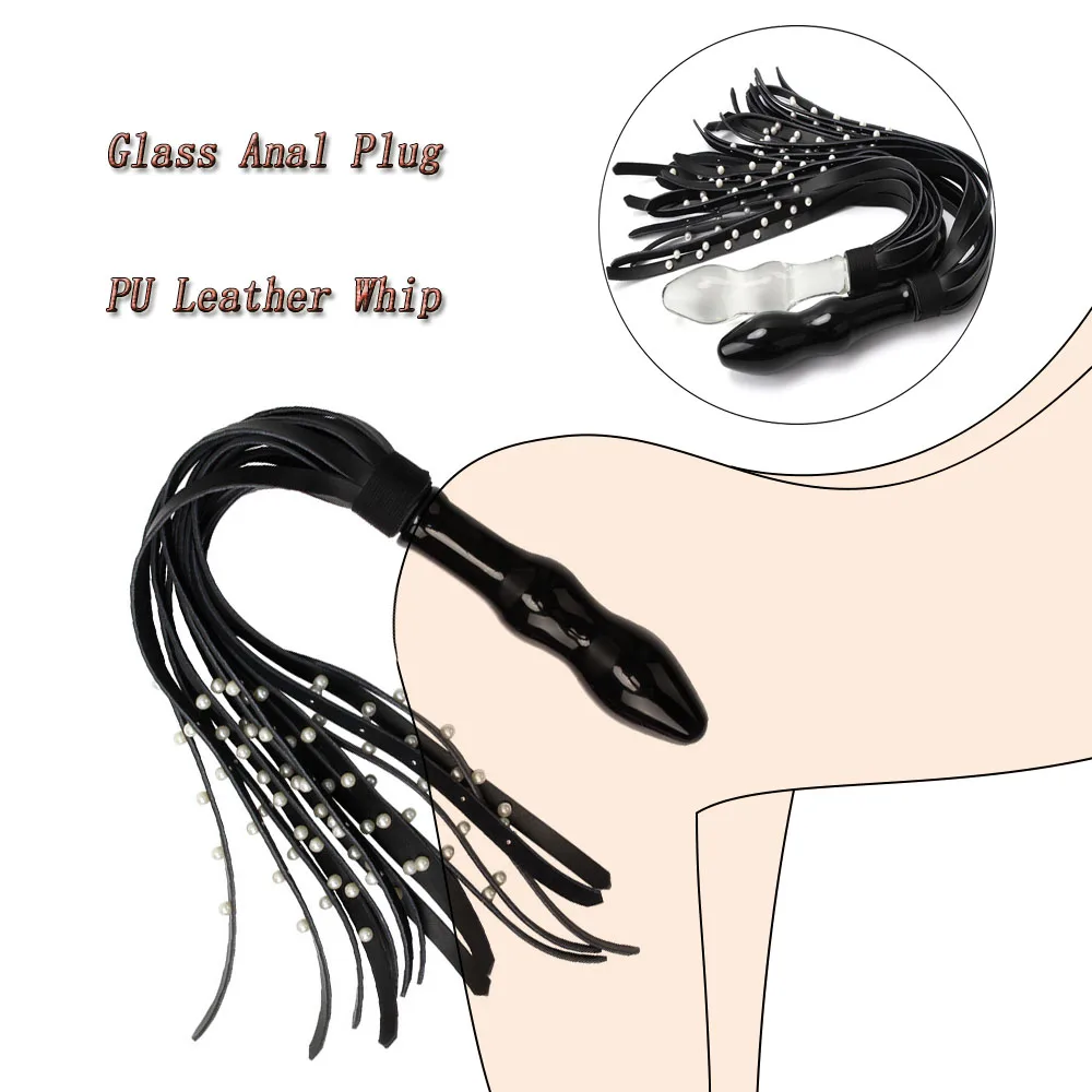 Leather Pearl Whip And Glass Anal Plug Adult Games BDSM Flogger Whipping Slave Butt Plug Massager F